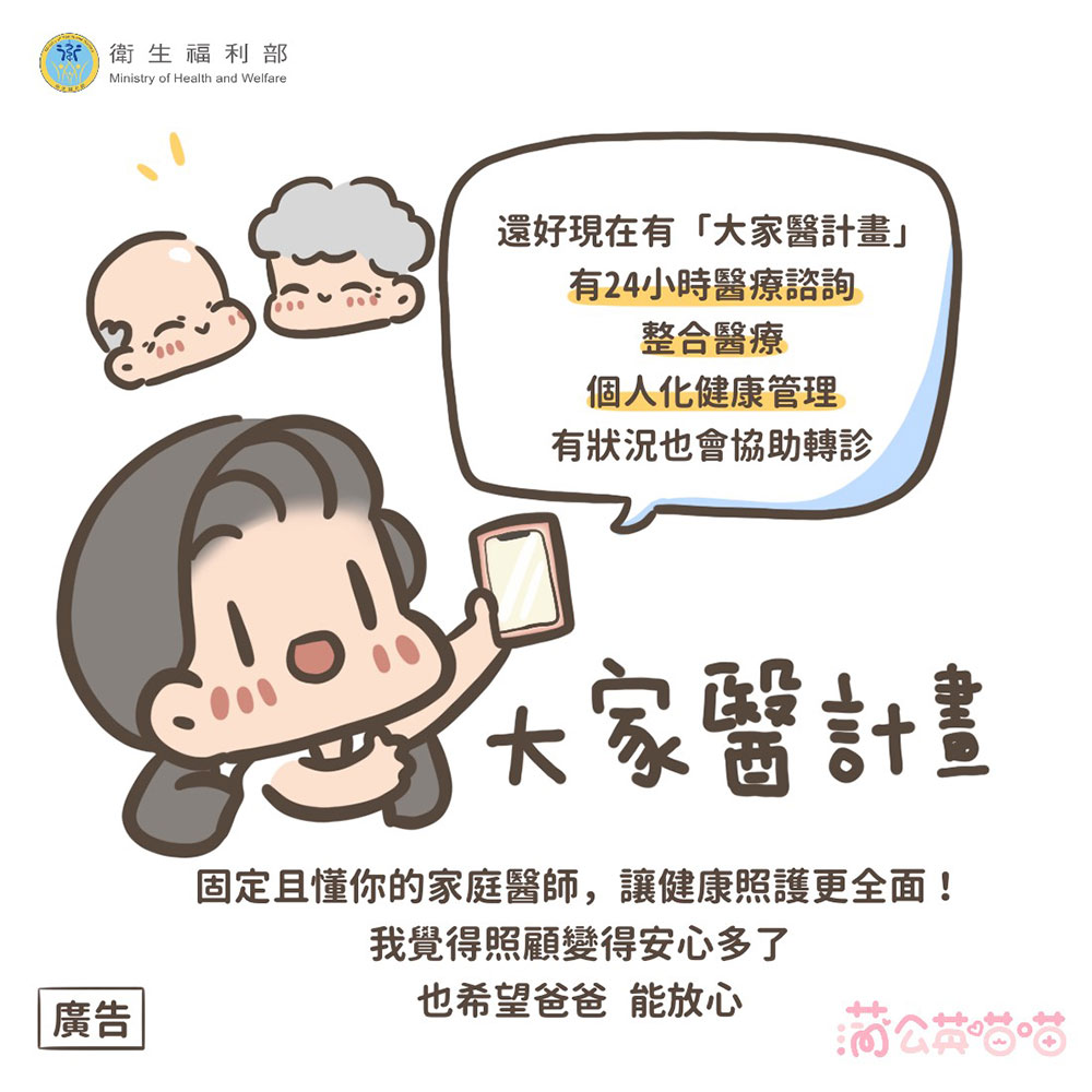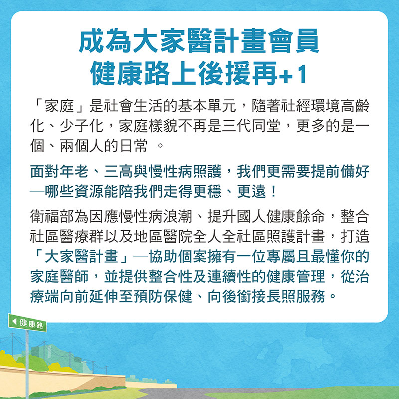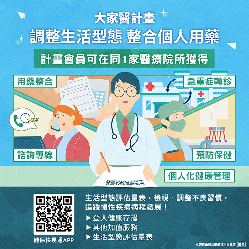 「大家醫計畫」以家庭醫師制度為核心,協助病人整合慢性病用藥與生活型態管理,讓醫療從醫院延伸到日常,落實全人照護。