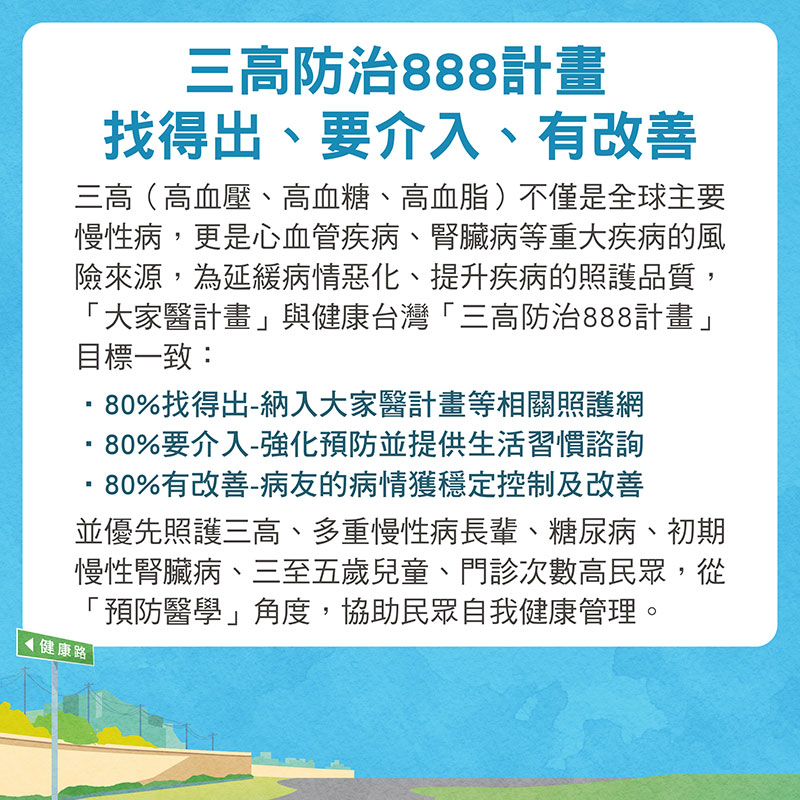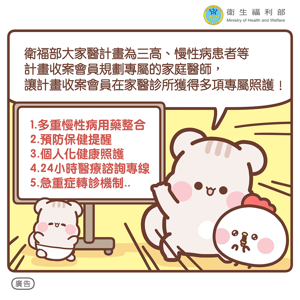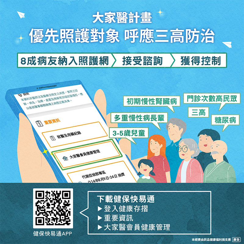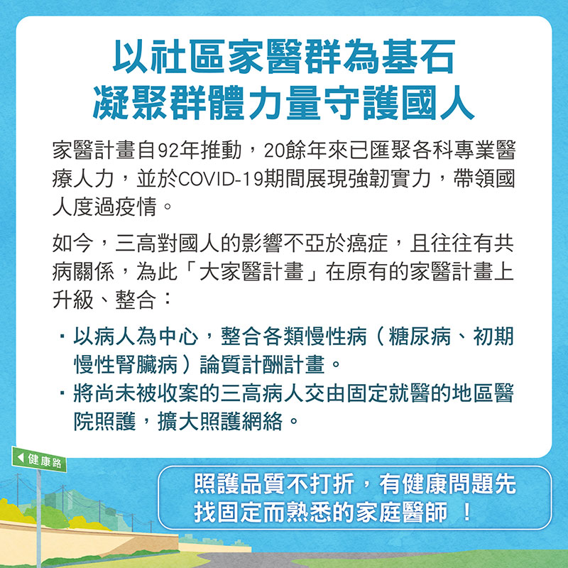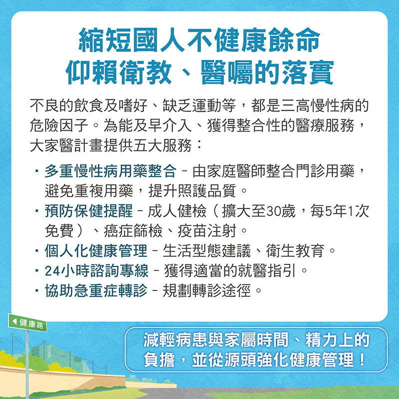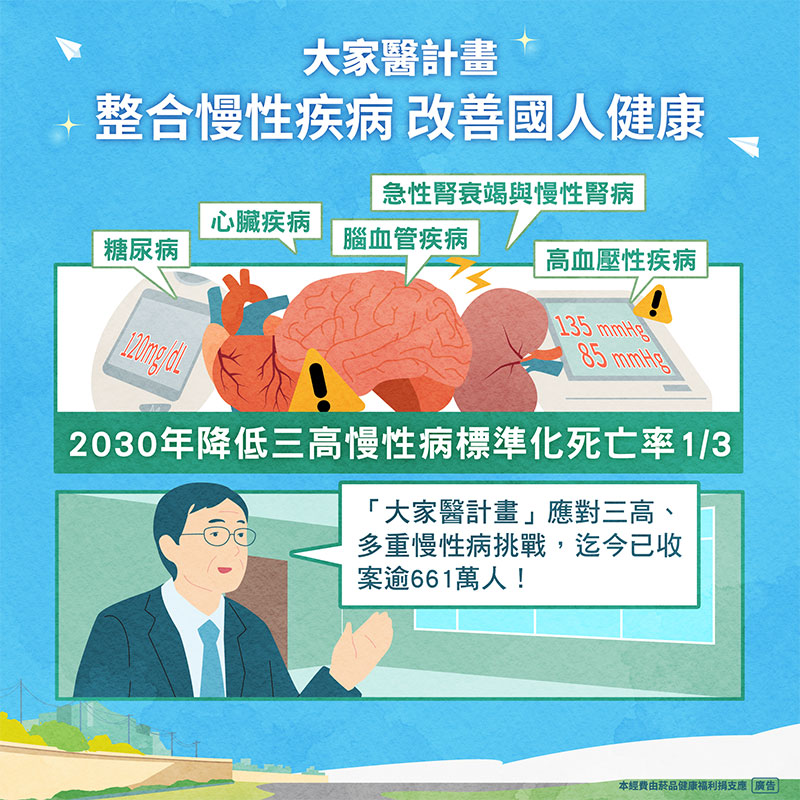 「大家醫計畫」整合糖尿病、初期慢性腎臟病及代謝症候群方案,導入數位服務,加強家醫計畫醫師的疾病管理能力,提升慢性病照護品質。