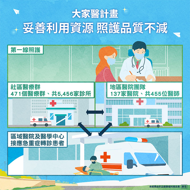 「大家醫計畫」強調分級醫療與緊密合作。民眾在診所或地區醫院追蹤三高慢性病,出現特殊症狀則啟動轉診流程,確保患者獲得妥善醫療照護。